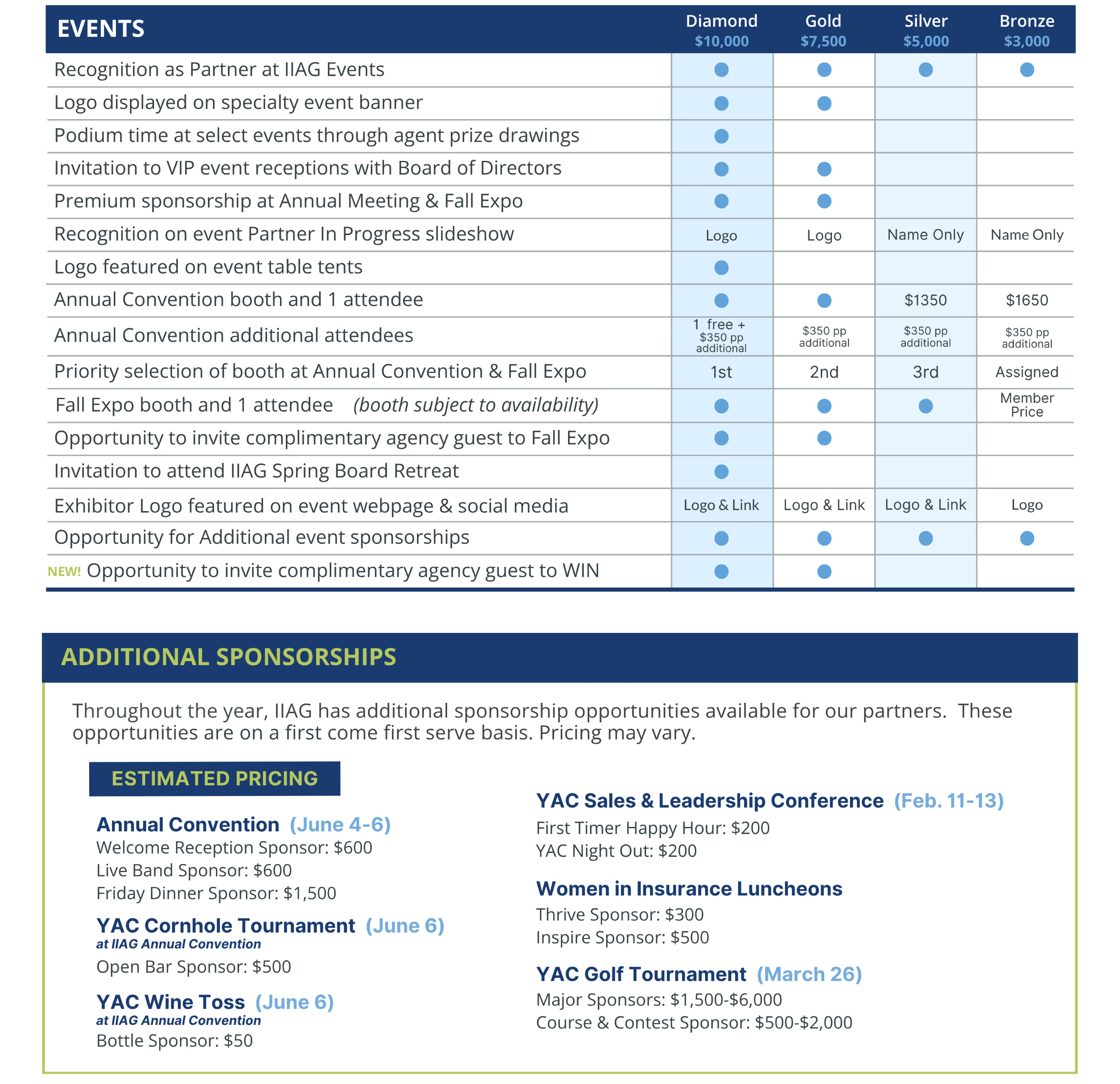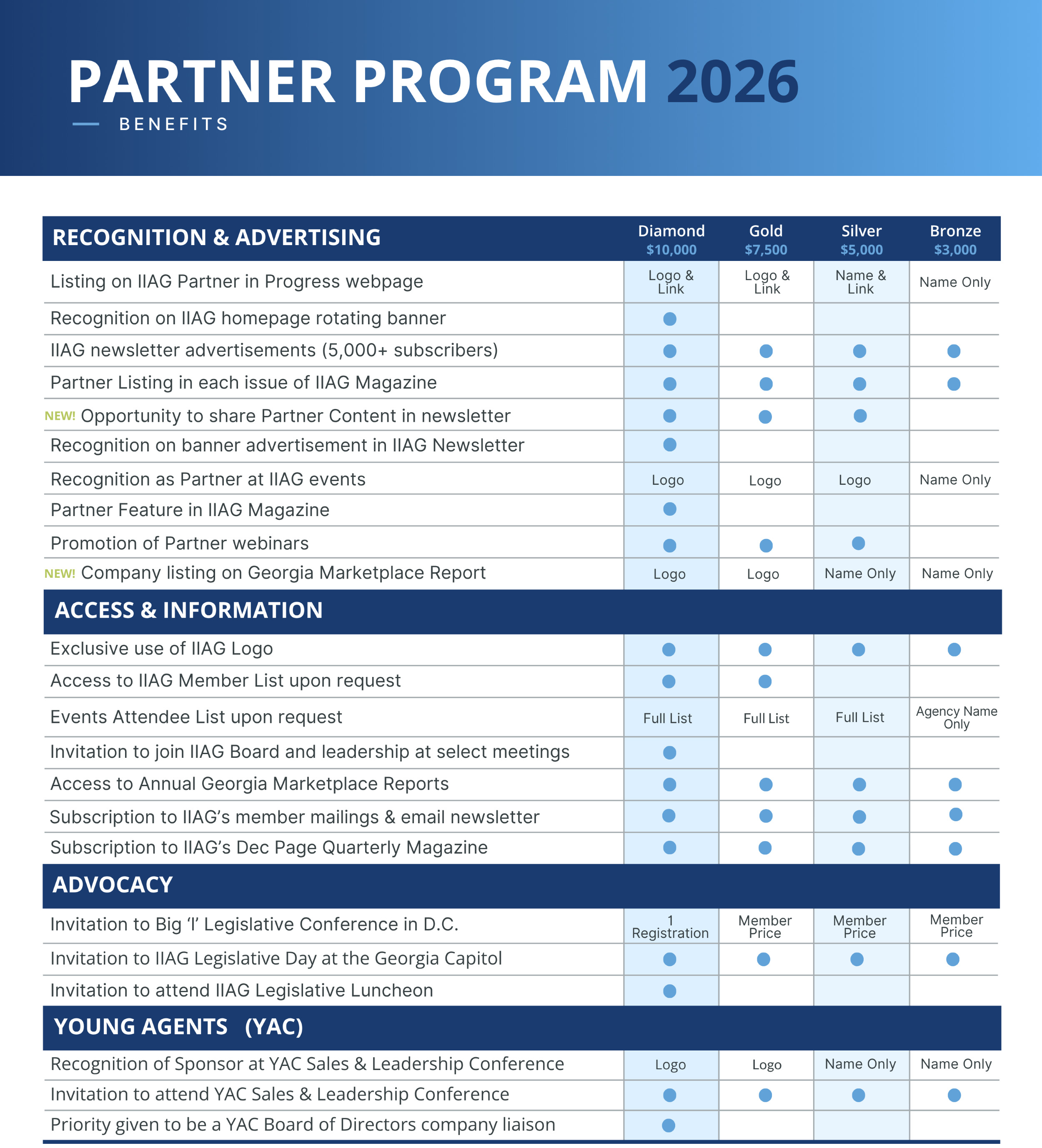 IIAG serves Georgia's independent insurance agents by developing programs and services designed to help member agencies achieve more collectively. Our Partners in Progress Program was created for companies, wholesalers, and vendors that wish to gain exposure through communications and our events to IIAG members and support the association on an ongoing basis.